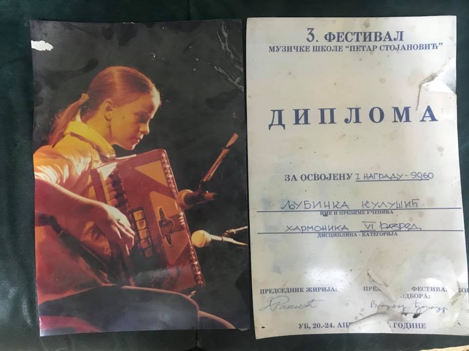 “Danas mi je u gradu prišla nepoznata osoba i pitala da li sam ja Ljubinka. Nakon što sam to potvrdila, rekla je da ima nešto za mene. Ova divna osoba je prolazeći kroz hodnik muzičke škole u Zvorniku u kanti za otpatke našla pocijepane moje slike i diplome sa takmičenja.