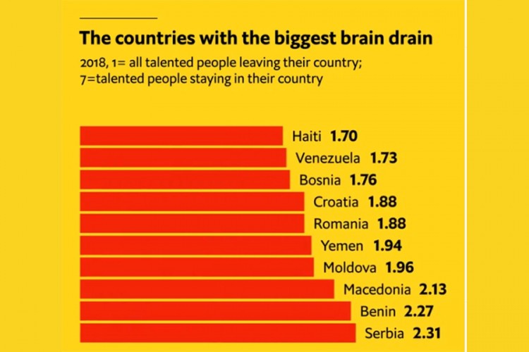 Časopis “The Economist” objavio je na Instagramu infografiku prema kojoj Bosna i Hercegovina zauzima neslavnu treću poziciju u svijetu po “odlivu mozgova”, pozivajući se na Izvještaj o globalnoj konkurentnosti Svjetskog ekonomskog foruma za 2018. godinu.