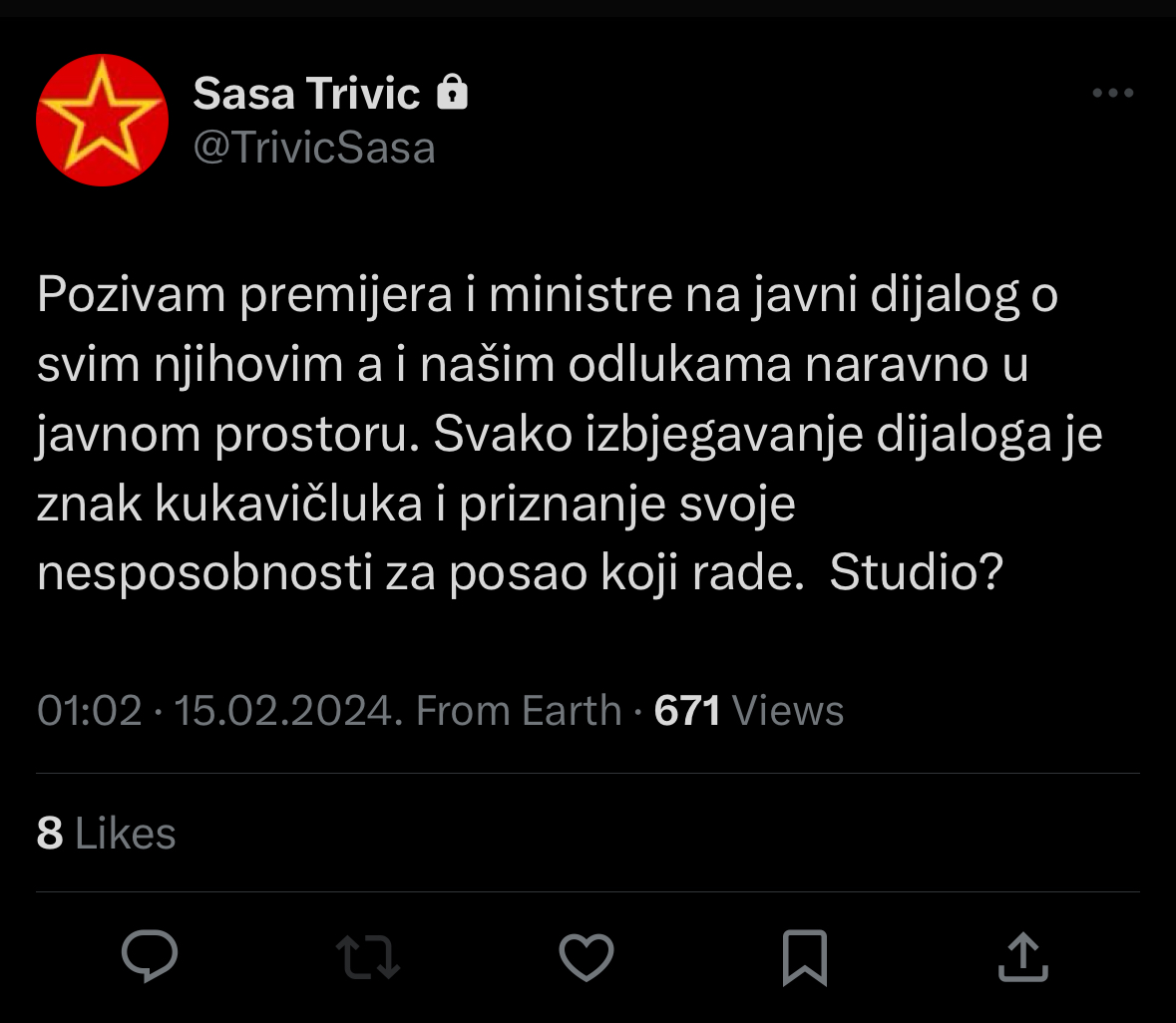 „Pozivam premijera i ministre na javni dijalog o svim njihovim a i našim odlukama, naravno u javnom prostoru. Svako izbjegavanje dijaloga je znak kukavičluka i priznanje svoje nesposobnosti za posao koji rade. Pozivam sve zainteresovane od političara pa na dalje za javni dijalog oko kokošinca u kojom smo se našli da se prijave u DM. Jedini sulov je ime i prezime i javni nastup. Kokošari, neznalice i kukavuice neka se jave svojim bračnim drugovima za liječenje kompelksa, ostali naprijed“, naveo je Trivić.