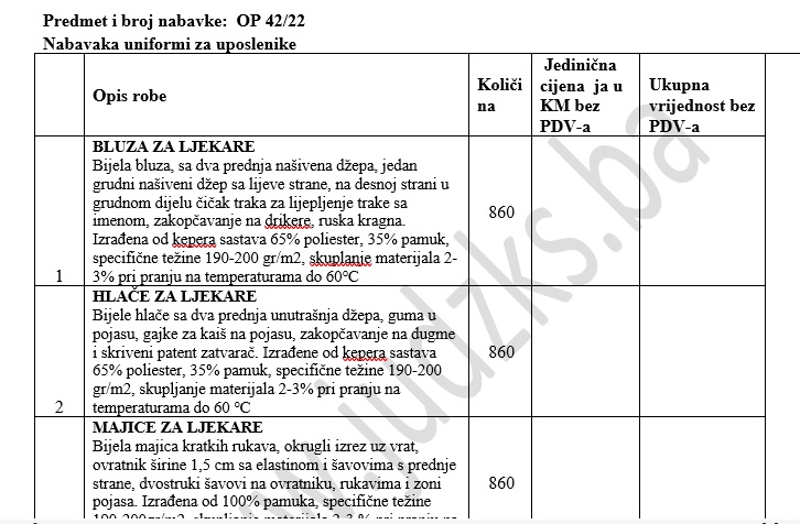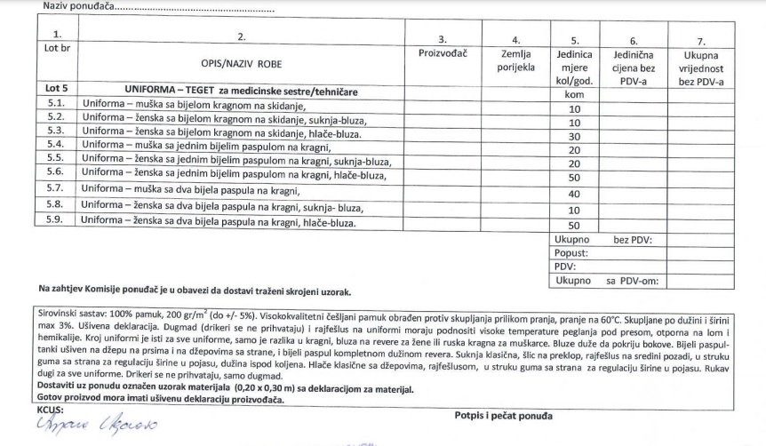 Predmet nabavke bile su bluze i hlače s majicama za ljekare, po 860 komada, zatim bluze, hlače i majice za medicinske sestre/tehničare, po 1.180 komada, te uniforme za vozače, higijeničarke, portire i službu tehničkih poslova.