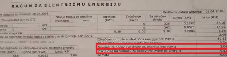 Ova naknada koja se prikuplja kasnije će se u vidu podsticaja dijeliti koncesionarima koji proizvode električnu energiju na bazi obnovljivih izvora energije. Navedena obaveza je nametnuta prije četiri godine, ali nije predstavljala značajnije opterećenje za građane i privredu do 1. januara ove godine kada je povećana i sada iznosi 0,52 feninga po kilovat času utrošene struje. Ukoliko uzmemo prosječnu mjesečnu potrošnju električne energije i pomnožimo sa 0,52 feninga dođemo do cifre od oko pet maraka za domaćinstvo i 300 maraka koliko u prosjeku plaćaju pravna lica. Na ove iznose treba obračunati i PDV što još više povećava navedenu naknadu.