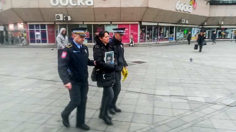 Policija, koje je oko 10 časova bilo malo, na Trgu Krajine žutom policijskom trakom ograđuje prostor oko “spomenika” Davidu Dragičeviću. Okupljeni građani negoduju, najglasnija je Davidova majka. Policija je u tim trenucima korektna. Obična uniformisana policija dobija pojačanje Jedinice za podršku a prostor ograđen trakom se širi nakon odbijanja novinara da se udalje sa trga. Nakon verbalnog sukoba u kontinuitetu sa policijom, dva policajca odvode Suzanu Radanović.