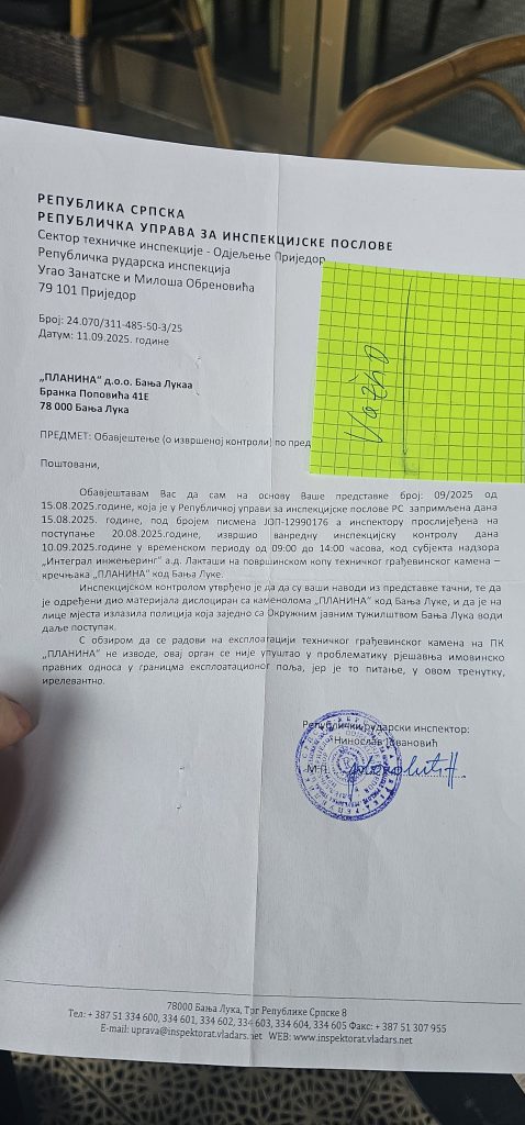 Republička uprava za inspekcijske poslove utvrdila je 11. septembra ove godine da je određeni dio materijala dislociran sa kamenoloma „Planine“ i da je zbog toga na lice mjesta izlazila policija. Inspekcija se nije bavila imovinsko-pravnim odnosima u kamenolomu, ali u „Planini“ smatraju da su stvari više nego jasne.