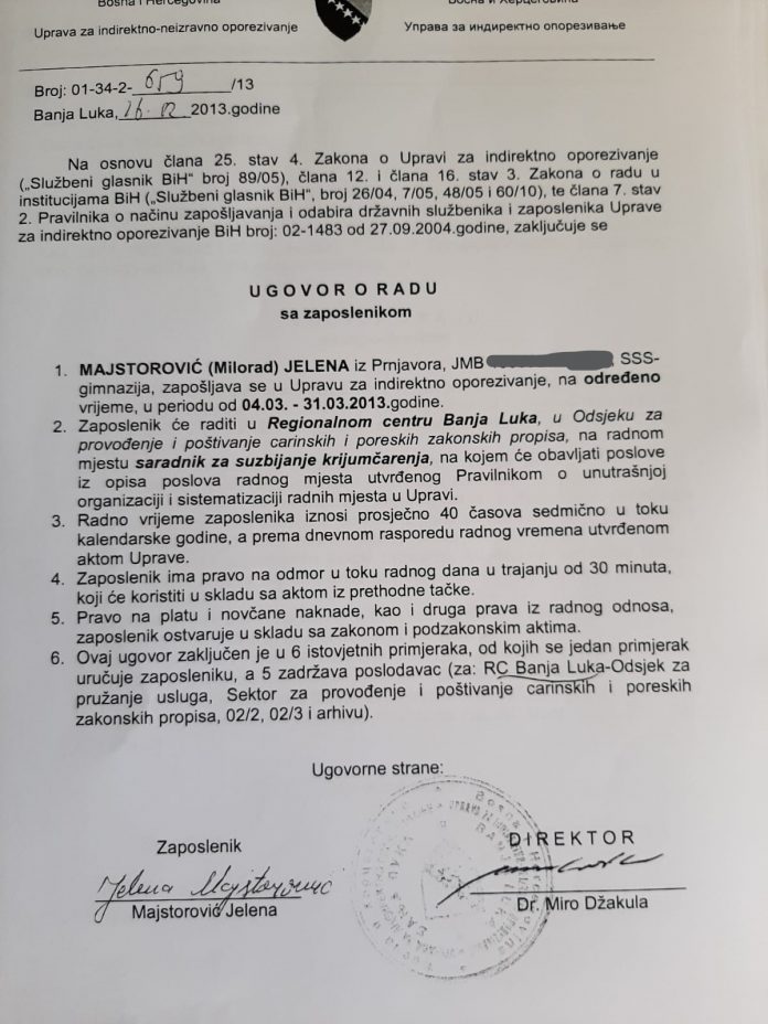 Sve je počelo 2013. godine, nakon što je Jelena Majstorović, i to jedva (s prosjekom ocjena 2.5), završila gimnaziju u Prnjavoru te je odmah primljena u UIO na radno mjesto saradnika za suzbijanje krijumčarenja, u RC Banja Luka, ali bez konkursa. Odmah se u startu postavlja pitanje zašto bi direktor jedne velike organizacije, kakve su državne carine, mimo konkursa zaključio Ugovor o radu sa nekim lošim đakom iz Prnjavora, kojeg „lično ne poznaje“, a što se vidi iz dokumenta koji objavljujemo.