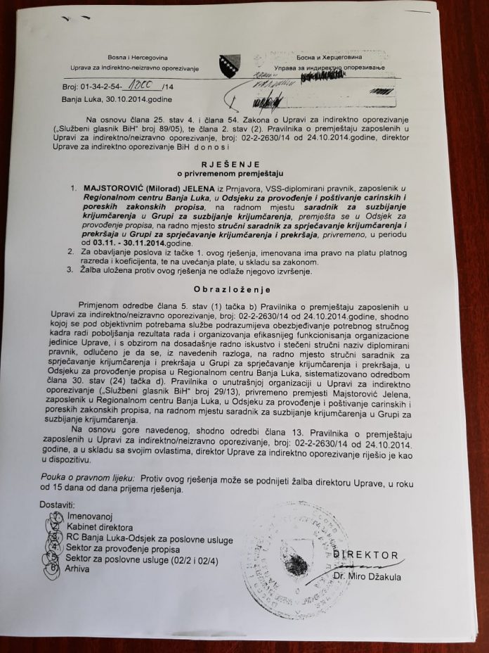 Kao obrazloženje je navedeno da je bila “najuspješniji kandidat za ovo radno mjesto”, iako prethodno niti jedan dan nije radila u Odsjeku za poreze! Ipak, iako je “briljirala” na konkursu u oblasti poreza, tu se zadržala tek dva radna dana pa je 7. maja 2018. premještena na radno mjesto višeg stručnog saradnika za sprječavanje krijumčarenja u Grupi za sprječavanje krijumčarenja i prekršaja u Odsjeku za provođenje propisa RC Banja Luka. Rješenje je potpisao – direktor Džakula, koji je inače dobro ne poznaje.
