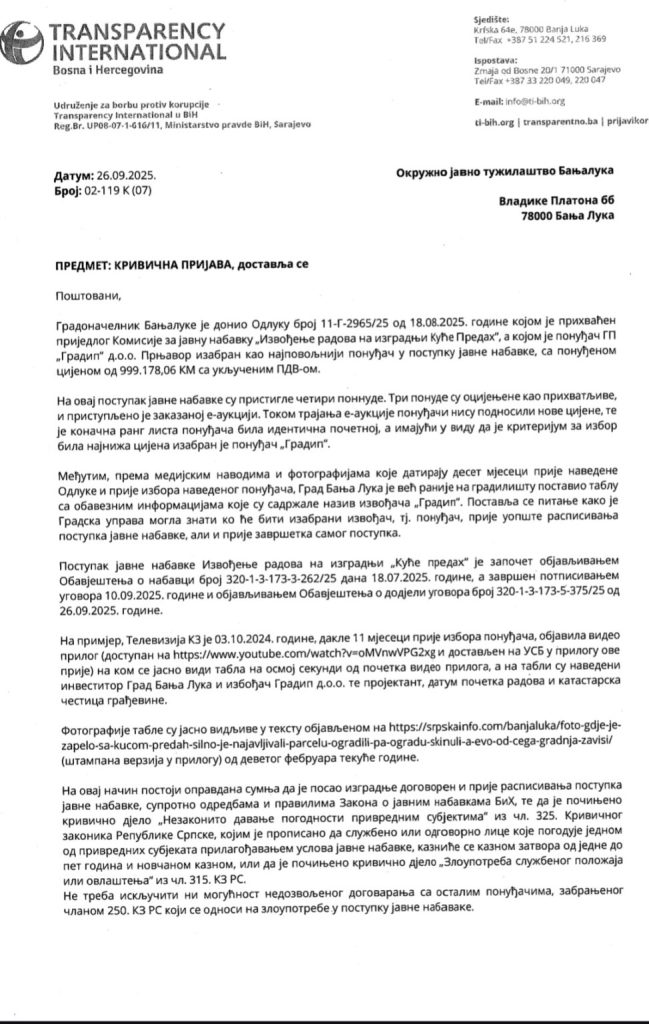“Na ovaj način postoji opravdana sumnja da je posao izgradnje dogovoren i prije raspisivanja postupka javne nabavke, suprotno odredbama i pravilima Zakona o javnim nabavkama BiH, te da je počinjeno krivično djelo Nezakonito davanje pogodnosti privrednim subjektima iz člana 325 Krivičnog zakona RS, kojim je propisano da službeno ili odgovorno lice koje pogoduje jednom od privrednih subjekata prilagođavanjem uslova javne nabavke kazniće se kaznom zatvora od jedne do pet godina, i novčanom kaznom”, piše u krivičnoj prijavi koju je OJT Banjaluka predao Transparency international.
