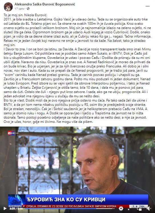 “To je moj sin. Nikola Đurović. 2011. je bila svadba u Laktašima. Gojko Vasić je udavao ćerku. Tada su se organizovale auto trke od Laktaša do BL. Totalno pijani svi. Sa strane na svakih 100m ih je čuvala policija. Kroz svako crveno svjetlo su prolazili velikom brzinom. Moj sin je najnormalnije izlazio na zeleno svjetlo, ni ne sluteći šta ga čeka. Ogromnom brzinom ga je udario Audi kojeg je vozio Čubrilović. Dodik, onako pijan, je vidio da sa desne strane izlazi auto, ali je Čubriju rekao Ko ga j… nagazi. Tačna informacija. Rekao mi je jedan čovjek koji naravno ne smije u javnosti to da kaže. Na žalost, tako je stradao moj sin”, navodi Aleksandra Đurović Bogosanović u komentaru na svom fejsbuk profilu.