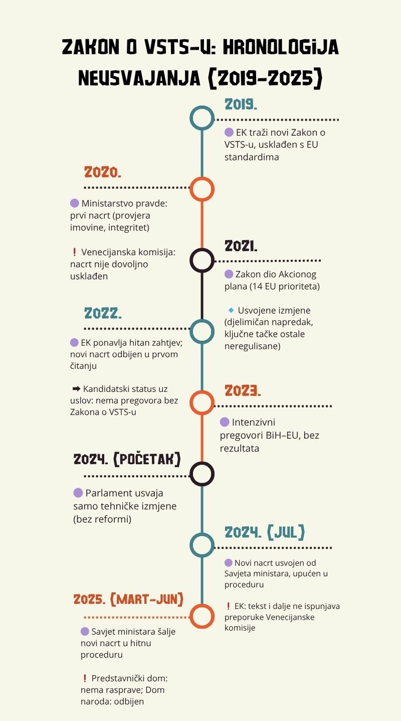 Evropska komisija je još 2019. godine, kao jedan od prioriteta u kontekstu evropskih integracija BiH, zatražila donošenje novog Zakona o VSTS, koji bi bio u skladu sa evropskim standardima. Takav zakon ni danas, šest godina kasnije, nije usvojen.