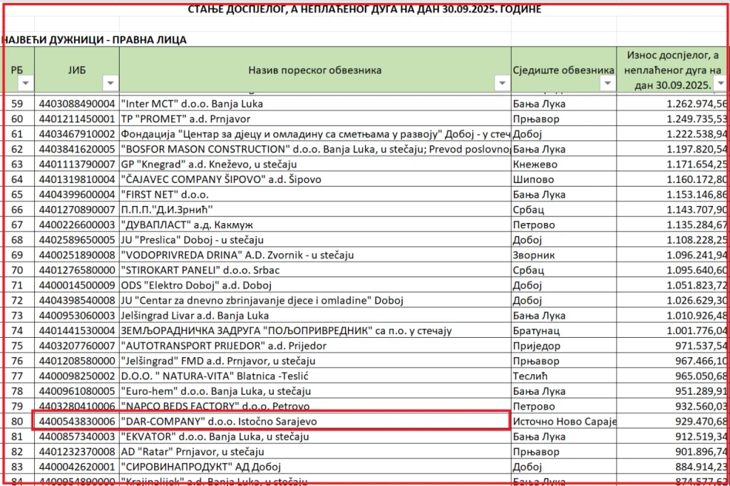Firma „DAR Company“ nalazi se na listi najvećih dužnika Poreske uprave Republike Srpske. Zaključno sa septembrom ove godine Poreskoj upravi duguju skoro milion maraka, odnosno 929.470 KM. Iako je firma ugašena, dug nikada nije uplaćen.