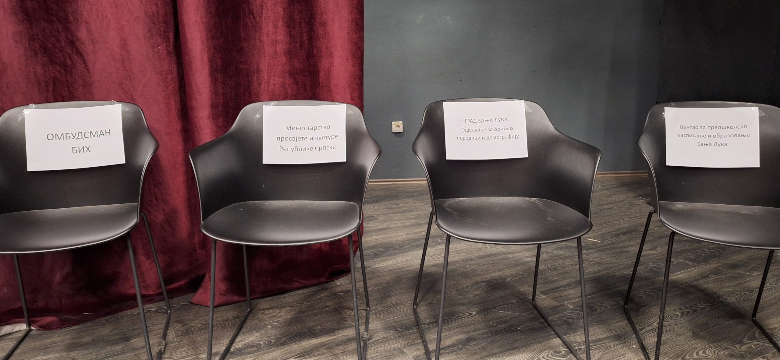 Međutim, nisu imali sagovornike iz institucija, ali ni roditelje kojima bi objasnili suštinu problema diskriminacije djece. Prazne stolice predviđene za predstavnike Ministarstva prosvjete i kulture Republike Srpske, Grada Banja Luka i Centra za predškolsko vaspitanje i obrazovanje govore više od 1000 riječi.