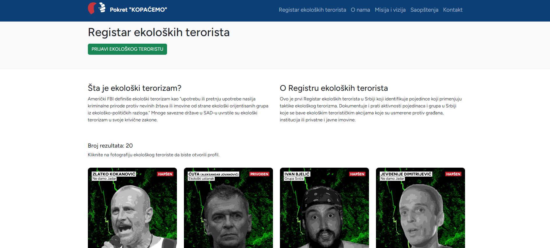 Pokret “Kopaćemo” koristi slične metode, kao što se vidi u stvaranju “registra ekoloških terorista”, što je jasan primjer kako se identifikacija i targetiranje neistomišljenika koristi kao sredstvo kontrole i represije. Ovakve prakse nisu samo izolovane kampanje već dio šireg, dobro uhodanog mehanizma vlasti za suzbijanje opozicije.