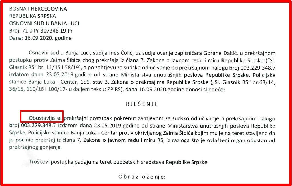 Podsjećamo, Zaimu Šibiću i Rajku Topiću MUP RS je izdao prekršajne naloge zbog kršenja javnog reda i mira, kako tvrde u policiji, zbog toga što su u maju 2019. godine uzviknuli “pravda”.