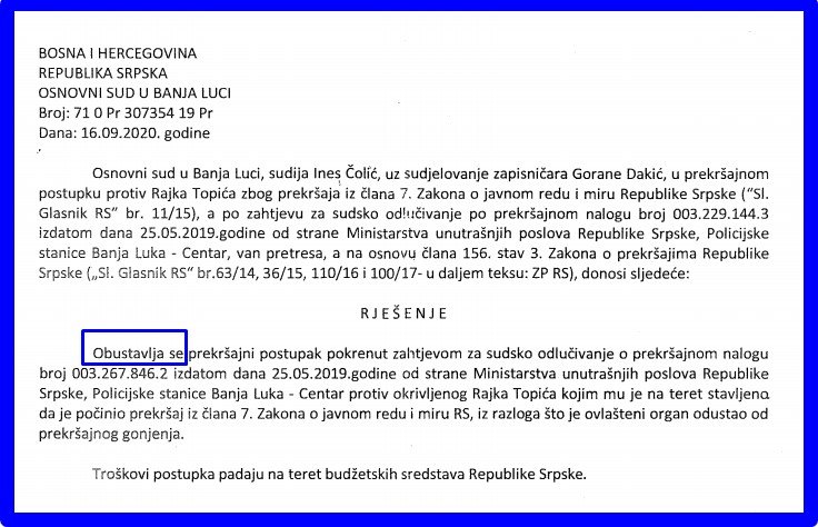Osnovni sud u Banjaluci je članovima grupe “Pravda za Davida” Zaimu Šibiću i Rajku Topiću poslao rješenja o obustavljanju prekršajnih postupaka protiv njih. Postupci se obustavljaju, kako se navodi u rješenjima, zato što je Ministarstvo unutrašnjih poslova Republike Srpske, Policijska stanica Banja Luka – Centar, koje je pokrenulo zahtjev za sudsko odlučivanje, odustalo od prekršajnog gonjenja.