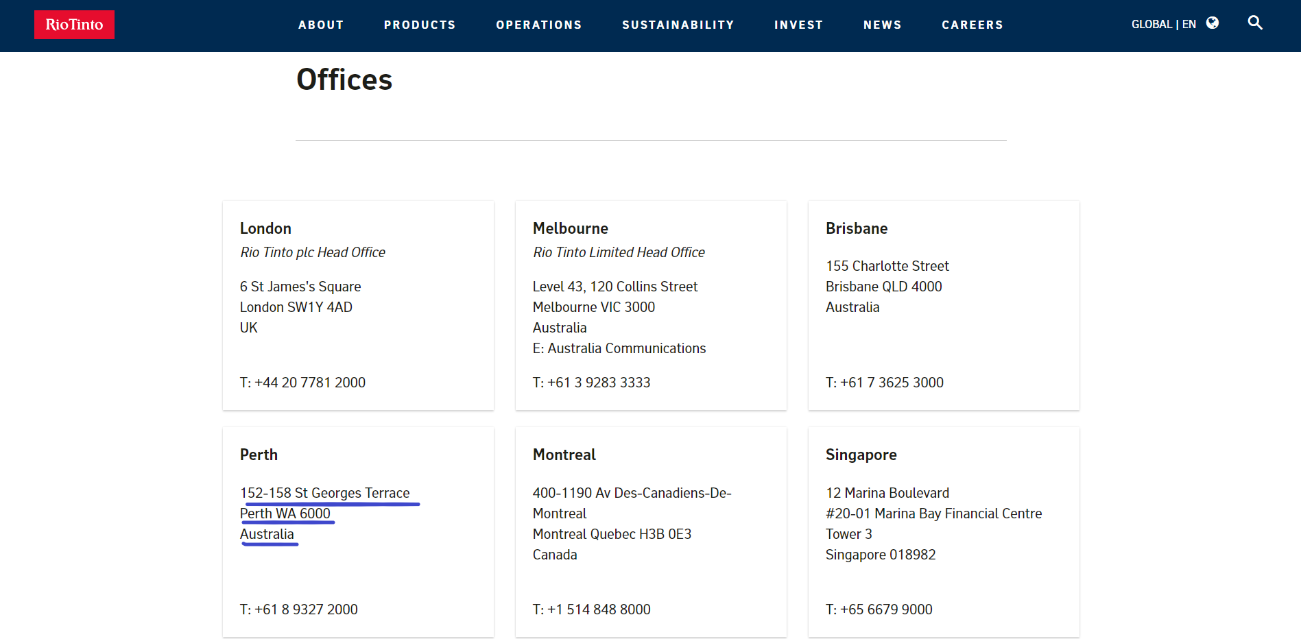 Ono što je zanimljivo je da se jedna od kancelarija famozne kompanije Rio Tinto nalazi na istoj adresi – 152-158 St Georges Terrace Perth WA 6000 Australia.