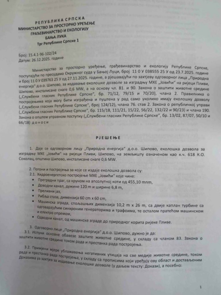 U rješenju Ministarstva, koje je doneseno „postupajući po presudama Okružnog suda u Banjaluci“, navodi se da se dozvola izdaje na osnovu Zakona o zaštiti životne sredine, Zakona o republičkoj upravi i Zakona o opštem upravnom postupku. Ipak, suštinski prigovori koje je sud ranije prihvatio – uključujući pitanje javnog interesa i zaštite rijeke – ostali su bez stvarnog odgovora.