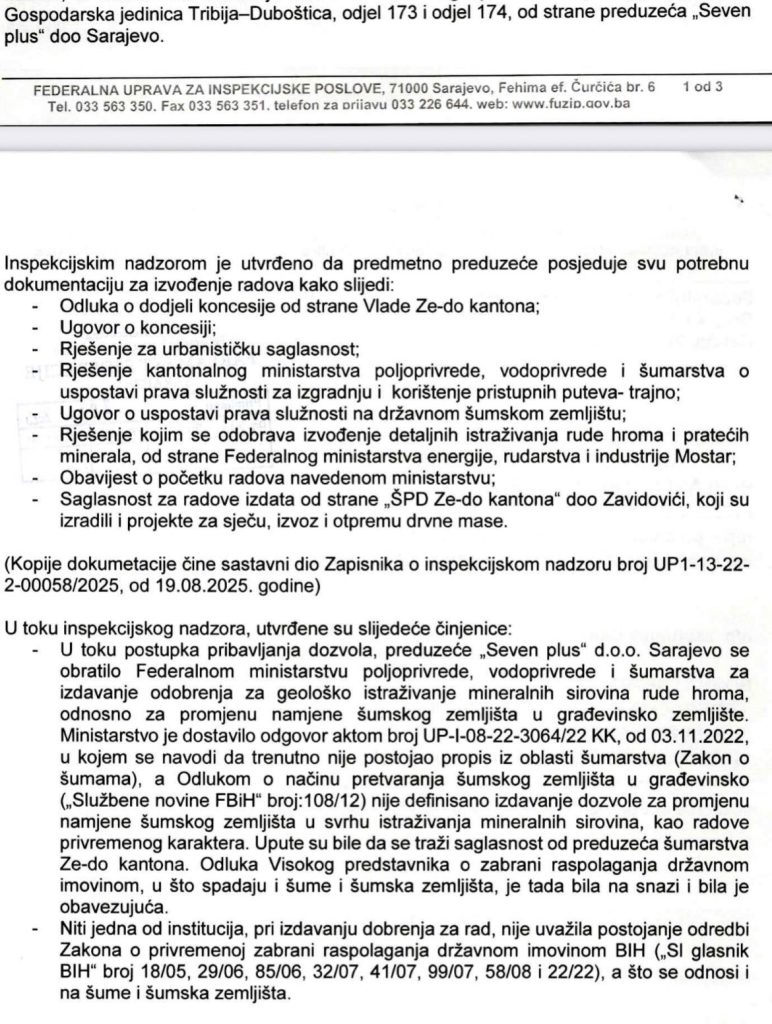 Federalna uprava za inspekcijske poslove potvrđuje da je tokom augusta 2025. godine izvršen zajednički inspekcijski nadzor glavnog federalnog šumarskog inspektora i kantonalne šumarske inspekcije Zeničko-dobojskog kantona, i to na odjelima 173 i 174 Šumsko-gospodarske jedinice Tribija–Duboštica. Nadzor je sproveden nad radovima koje je izvodila firma „Seven Plus“, koja je u međuvremenu promijenila ime u “Vareški minerali”.