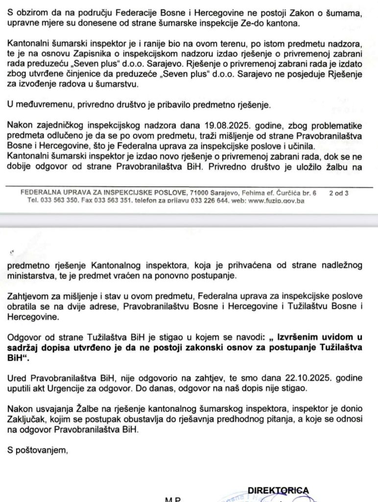Nakon zajedničkog inspekcijskog nadzora 19. augusta 2025. godine, Federalna uprava za inspekcijske poslove zatražila je mišljenje Pravobranilaštva Bosne i Hercegovine i Tužilaštva BiH.
