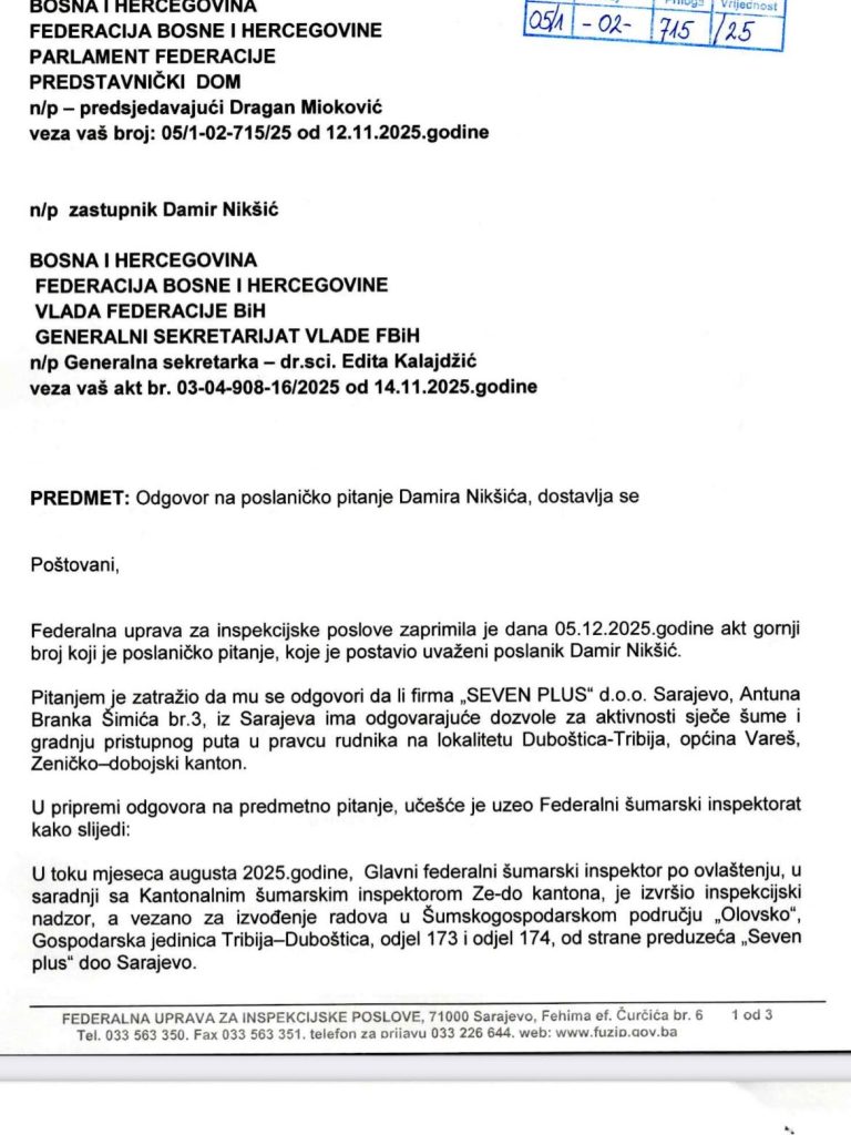 Odgovor Federalne uprave za inspekcijske poslove na poslaničko pitanje zastupnika Damira Nikšića, koji se odnosi na aktivnosti firme „Seven Plus“ d.o.o. Sarajevo (od skora “Vareški minerali”) na lokalitetu Duboštica–Tribija kod Vareša, otvorio je više pitanja nego što je ponudio odgovora. Iako se u zvaničnom aktu navodi da je preduzeće, nakon niza inspekcijskih nadzora, pribavilo „svu potrebnu dokumentaciju“ za sječu šume i izgradnju pristupnog puta prema rudniku, pažljivim čitanjem dokumenata postaje jasno da je čitav postupak sproveden mimo važećih zakonskih zabrana koje se odnose na državnu imovinu – uključujući šume i šumsko zemljište.