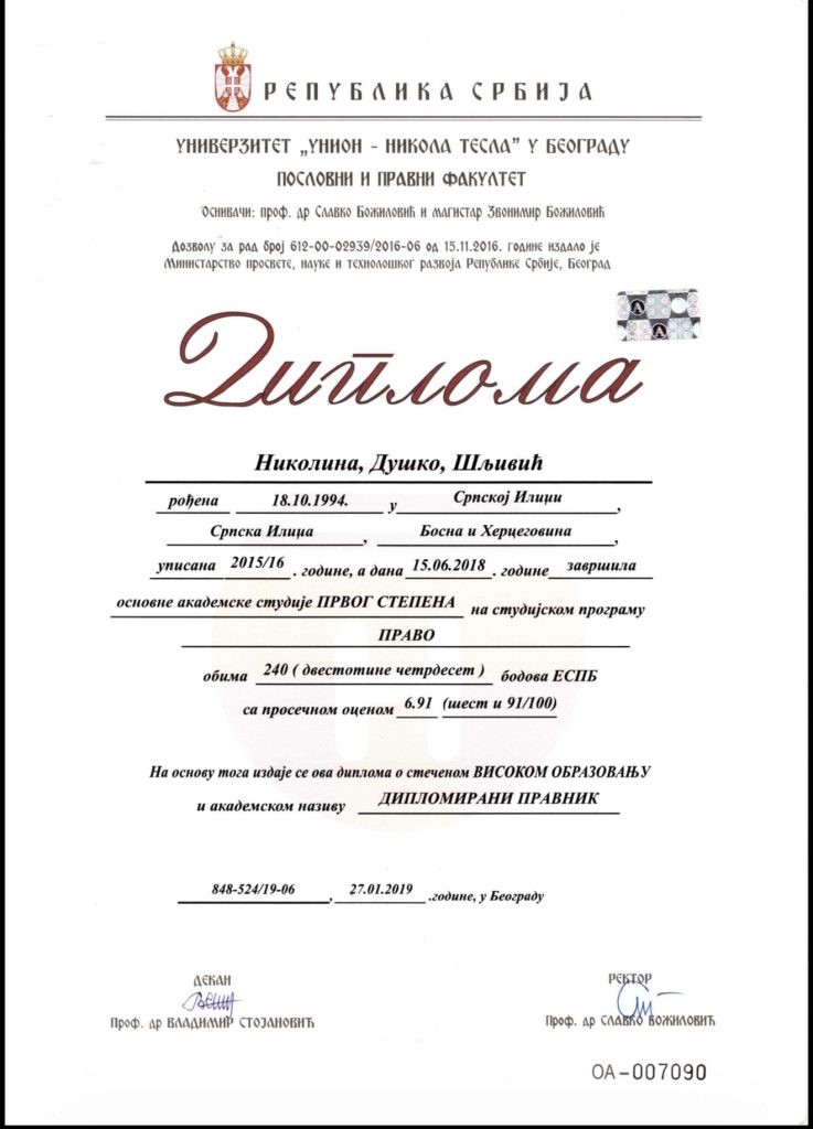 Poslanik Ujedinjene Srpske u Narodnoj skupštini Republike Srpske Nikolina Šljivić objavila je juče svoju pravničku diplomu kako bi svima obznanila gdje je stekla zvanje preko kojeg je, uz pomoć stranke, došla do pozicije v.d. zamjenika dirketora u Republičke uprave za geodetske i imovinsko-pravne poslove (RUGIP).