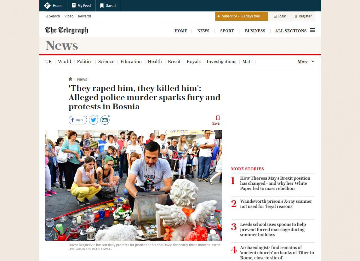 Britanski The Telegraph donosi priču o protestu „Pravda za Davida“ koji se svakodnevno održava u Banjaluci zbog nerazjašnjenog ubistva Davida Dragičevića. U tekstu se, pored retrospektive nemilog događaja, ističe da protesti mogu uzdrmati vlast u Republici Srpskoj i to u situaciji kada jačaju optužbe na račun zapadnih vlada da su dozvolile da se poslijeratna BiH privatizuje od strane korumpiranih elita.