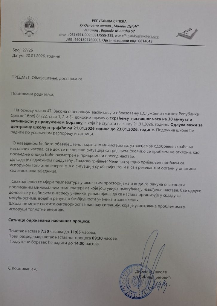 Prema zvaničnom dopisu uprave škole od 20. januara, nastava je skraćena zbog problema sa isporukom toplotne energije. Časovi traju kraće, produženi boravak ne radi, a roditelji su obaviješteni da se situacija prati iz dana u dan.